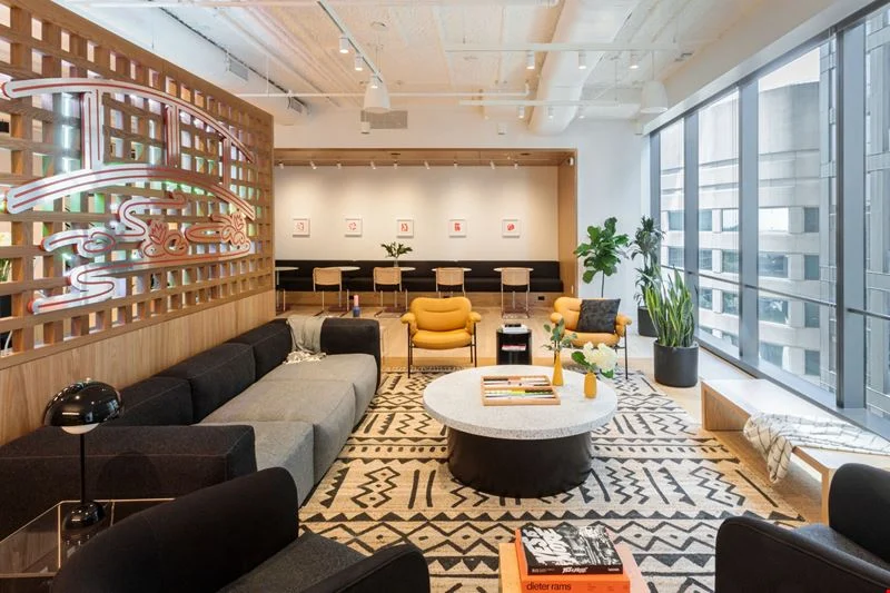 Occupying three sun-drenched floors, the coworking space—powered by WeWork—is a masterclass in intentional design. From the white oak millwork to the marble-clad common areas, every detail is crafted to inspire. Floor-to-ceiling windows provide 360-degree views of the DMV area, while custom acoustic panels and “zen-inspired” lounges ensure that even in a collaborative environment, deep focus remains a priority.